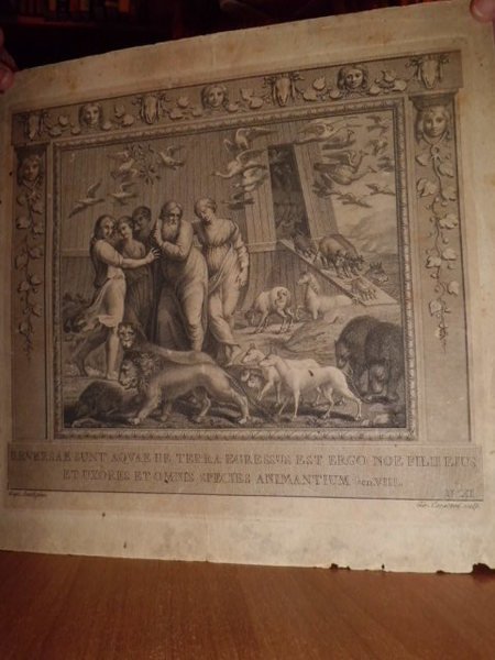 Reversae sunt aquae de terra egressus est ergo Noe filii ejus et uxores et omnis species animantium. Girolamo, CARATTONI. Riva di Trento 1749 - Roma 1809? Stampa originale incisa da Carattoni Girolamo non datata (ma c. 1780). 25 X 27 cm. In buono stato di conservazione.