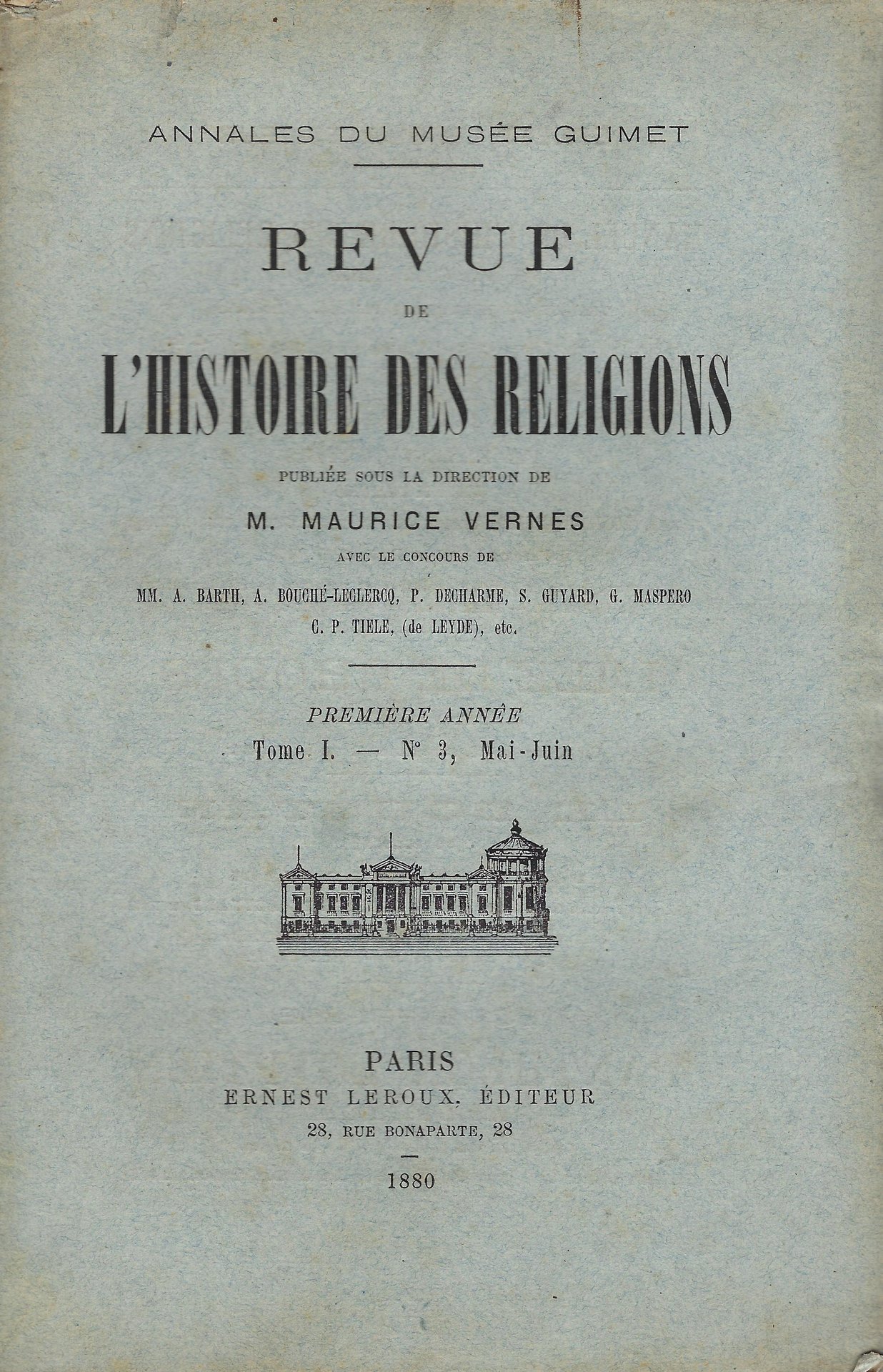 E. Leroux, 1880. Publiée sous la direction de M. Maurice Vernes avec le concours de MM. A. Barth, A. Bouché-Leclercq, P. Decharme, S. Guyard, G. Maspero et al. Première année, tome I, n.3 (Mai-Juin), 416 pp. copertina rigida Buono (Good) naturale ingiallimento dal tempo e lievi fioriture su alcune pagine, leggibilità perfetta, volume intonso.