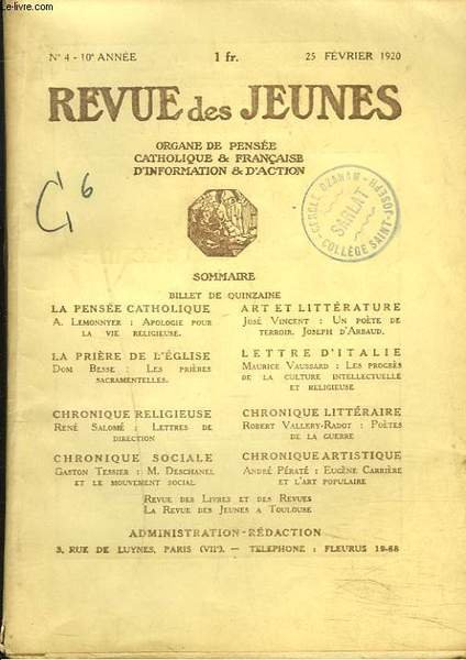 REVUE DES JEUNES. Organe de pensée catholique et française, d'information et d'action N°4, 10e ANNEE, 25 FEV. 1920. A. LEMONNYER, APOLOGIE POUR LA VIE RELIGIUSE/ JOSE VINCENT: UN POETE DE TERROIR JOSEPH D'ARBAUD/ DOM BESSE, LES PRIERES SACRAMENTELLES / . | Libri antichi e moderni | A.-D. Sertillanges (Directeur)