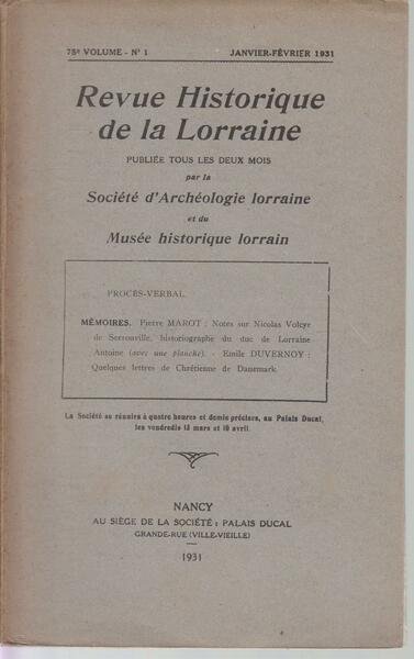 Revue Historique de la Lorraine, publiée tous les 2 mois par la Société d'Archéologie lorraine et du Musée historique lorrain - No 1 - Janvier-Février 1931