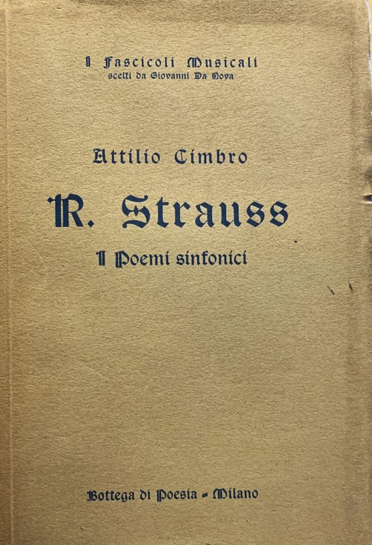 I ed. (15 marzo 1926). I Fascicoli Musicali scelti da Giovanni da Nova. XVI grande/ (6)+280/ brossura in cartoncino grigio con titoli in blu. Stato buono (leggera usura della copertina -copertina leggermente allentata nella rilegatura - quasi interamente intonso - pagine brunite). Indice: Riccardo Strauss - Il Poema sinfonico - Caratteri stilistici della musica straussiana - Le creazioni sinfoniche (Sinfonia in fa minore - Burlesca - Dall'Italia - Macbeth - Don Giovanni - Morte e trasfigurazione -Till Eulenspiegel - Così parlò Zaratustra - Don Chisciotte - Vita di eroe - Sinfonia domestica - Sinfonia delle Alpi) - Strauss ed il fenomeno musicale odierno.