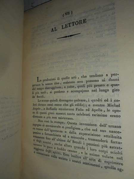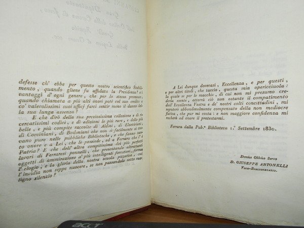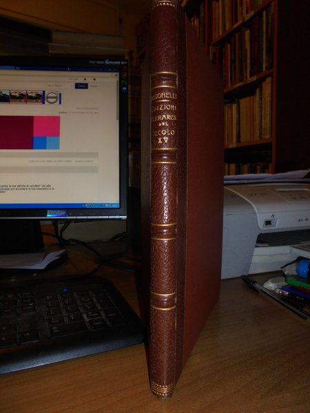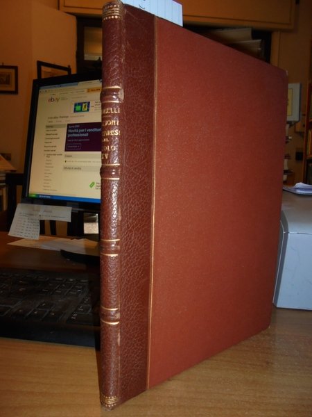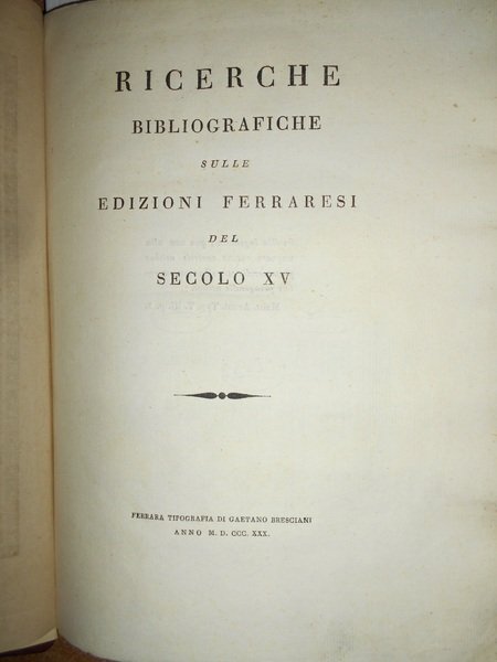 D. Giuseppe, Antonelli. Ferrara, Tipografia di Gaetano Bresciani, 1830. Ricerche bibliografiche sulle edizioni ferraresi del secolo XV. Edizione originale di questo studio sugli incunaboli di Ferrara. In-4°, m-pelle, dorso a 4 nervi con fregi e titolo in oro, le copertine originali sono conservate. XII, 115, (1) pp. con 3 tavole incise in legno nel testo. Ottimo esemplare con barbe. Neg. mob. 4