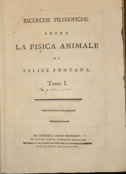 RICERCHE FILOSOFICHE SOPRA LA FISICA ANIMALE. Tomo I [unico pubblicato].