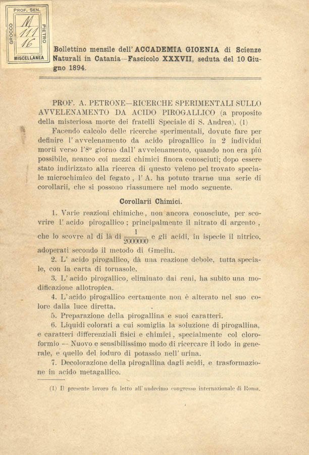 Ricerche sperimentali sullo avvelenamento da acido pirogallico | Libri antichi e moderni | Prof. A. Petrone