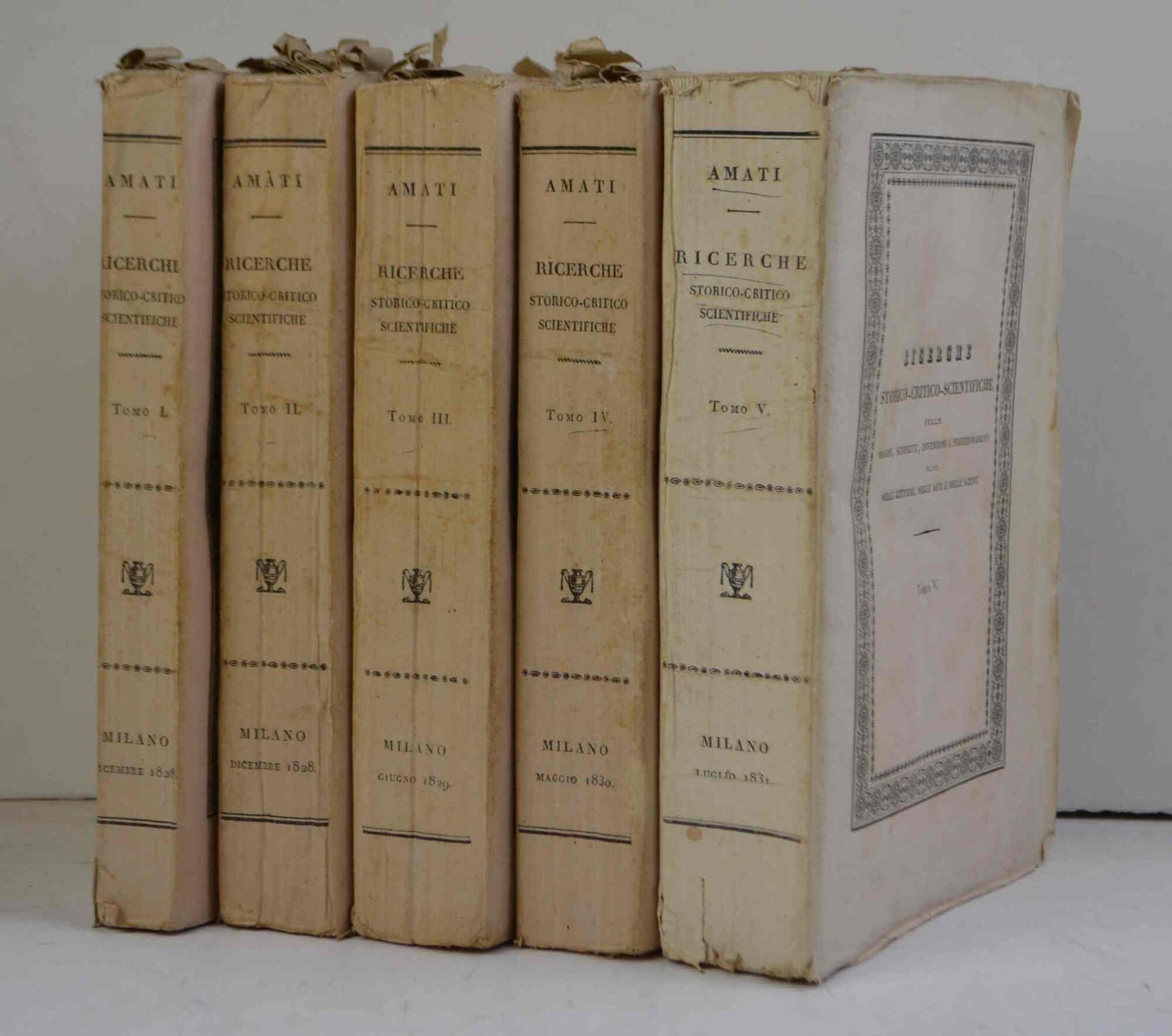 Cinque volumi di cm. 24, pp. oltre 2.500 complessive. Con ritratto dell'autore e 38 tavole fuori testo (anche ripiegate). Brossura originale con decorazioni e titoli a stampa. Esemplare particlarmente marginoso e genuino, a fogli chiusi ed in perfetto stato di conservazione. Celebre compilazione con interessanti capitoli sull'aerostatica, sui giochi di carte, scacchi, dadi, circo e burattini e, particolarmente, l'ultimo volume completamente dedicato alla storia della tipografia.