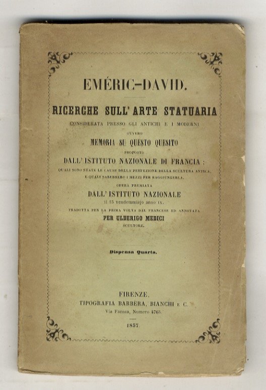 Ricerche sull'arte statuaria considerata presso gli antichi e i moderni ovvero memoria su questo quesito proposto dall'Ist. Nazionale di Francia: quali sono state le cause della perfezione della scultura antica, e quali sarebbero i mezzi per raggiungerla [.] Tradotta [.] per Ulderigo Medici. Dispensa quarta.