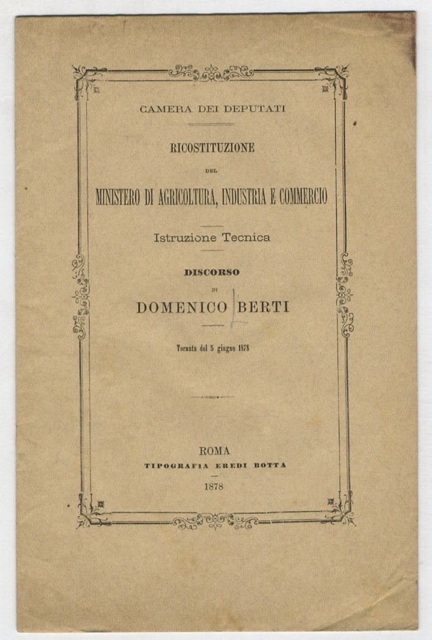Roma, Tip. Eredi Botta, 1878, in-8, brossura editoriale con cornice tipografica, pp. 18. Con invio autografo dell'autore.