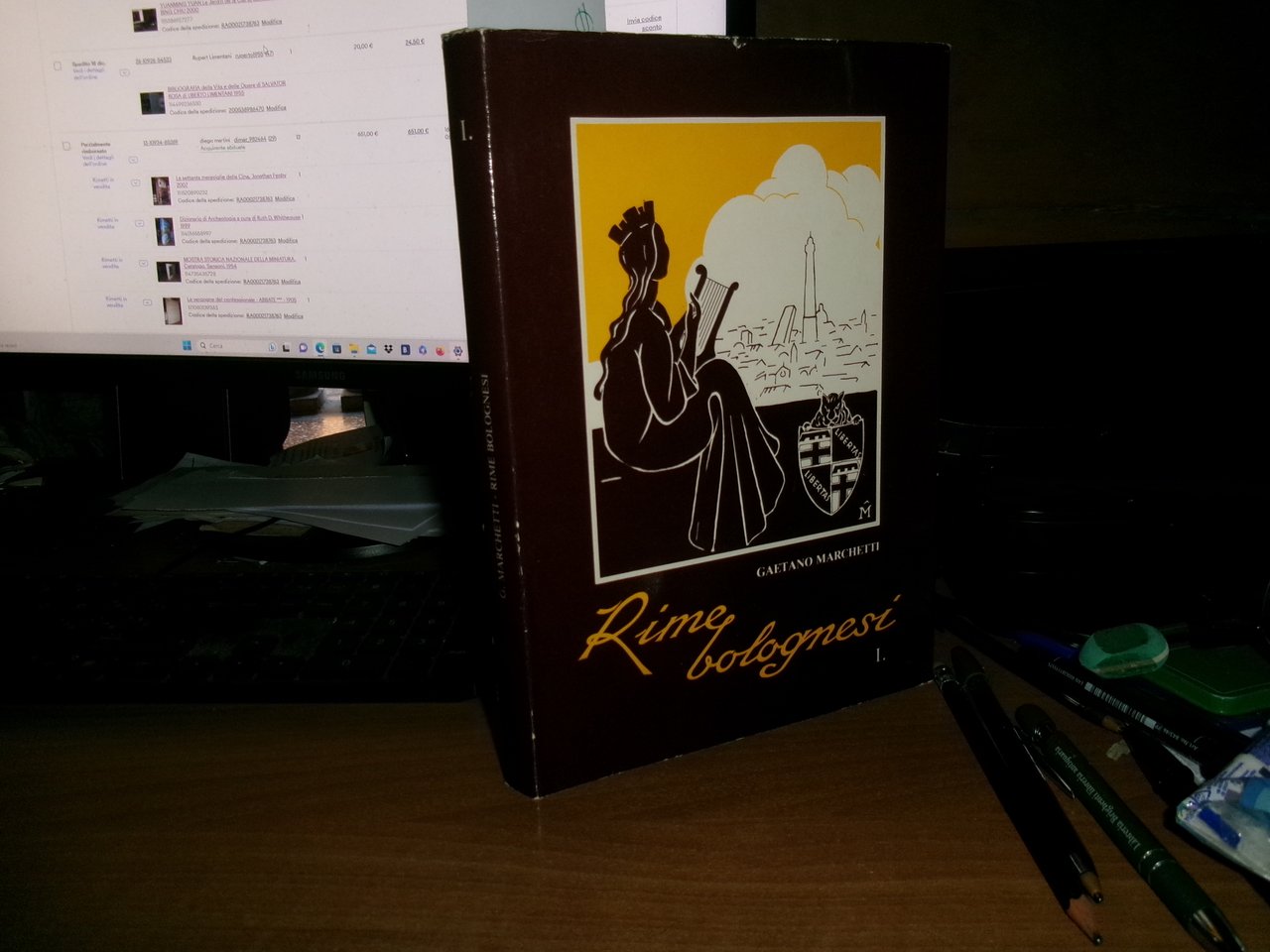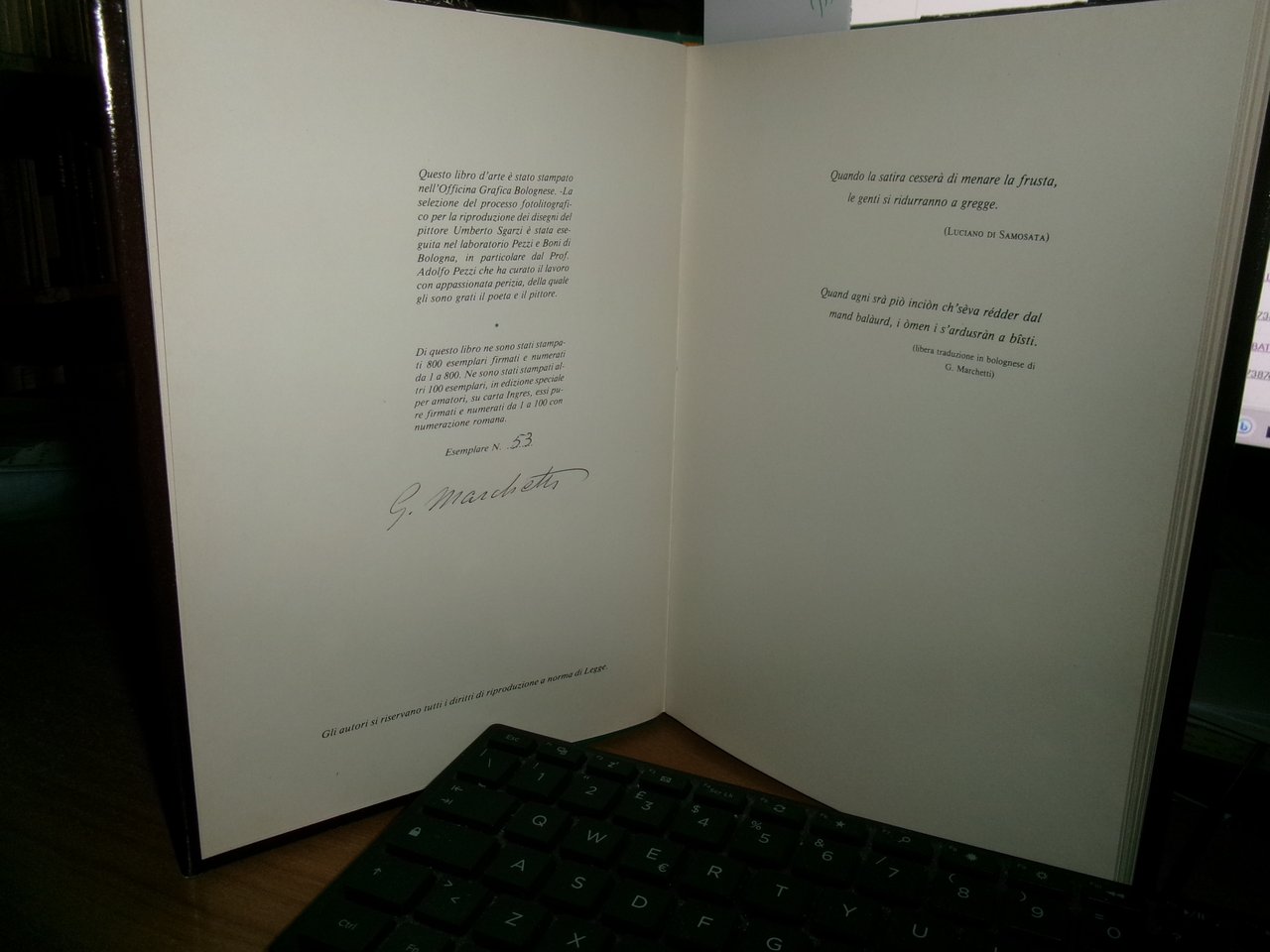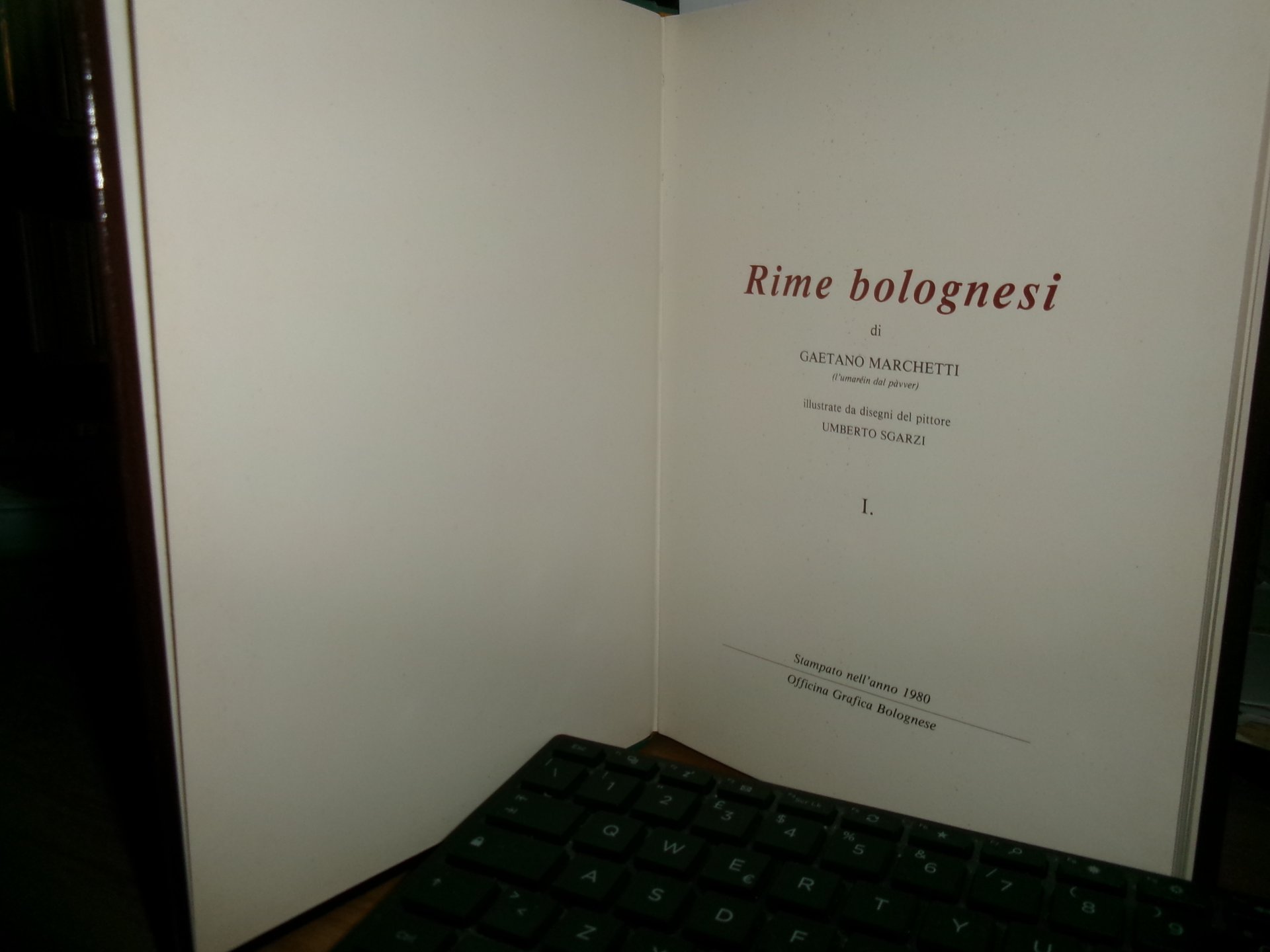GAETANO MARCHETTI. Bologna, Officina Grafica Bolognese, 1980. Rime Bolognesi. I. In-8°, tela verde edit. con titoli in oro, sovracopertina. 105, (2) pp. con numerose illustrazioni di Umberto Sgarzi. Edizione do soli 800 esemplari firmati e numerati. Sovracopertina con lievi segni d' uso ma libro ottimamente conservato. Neg. Bol. mob. 20