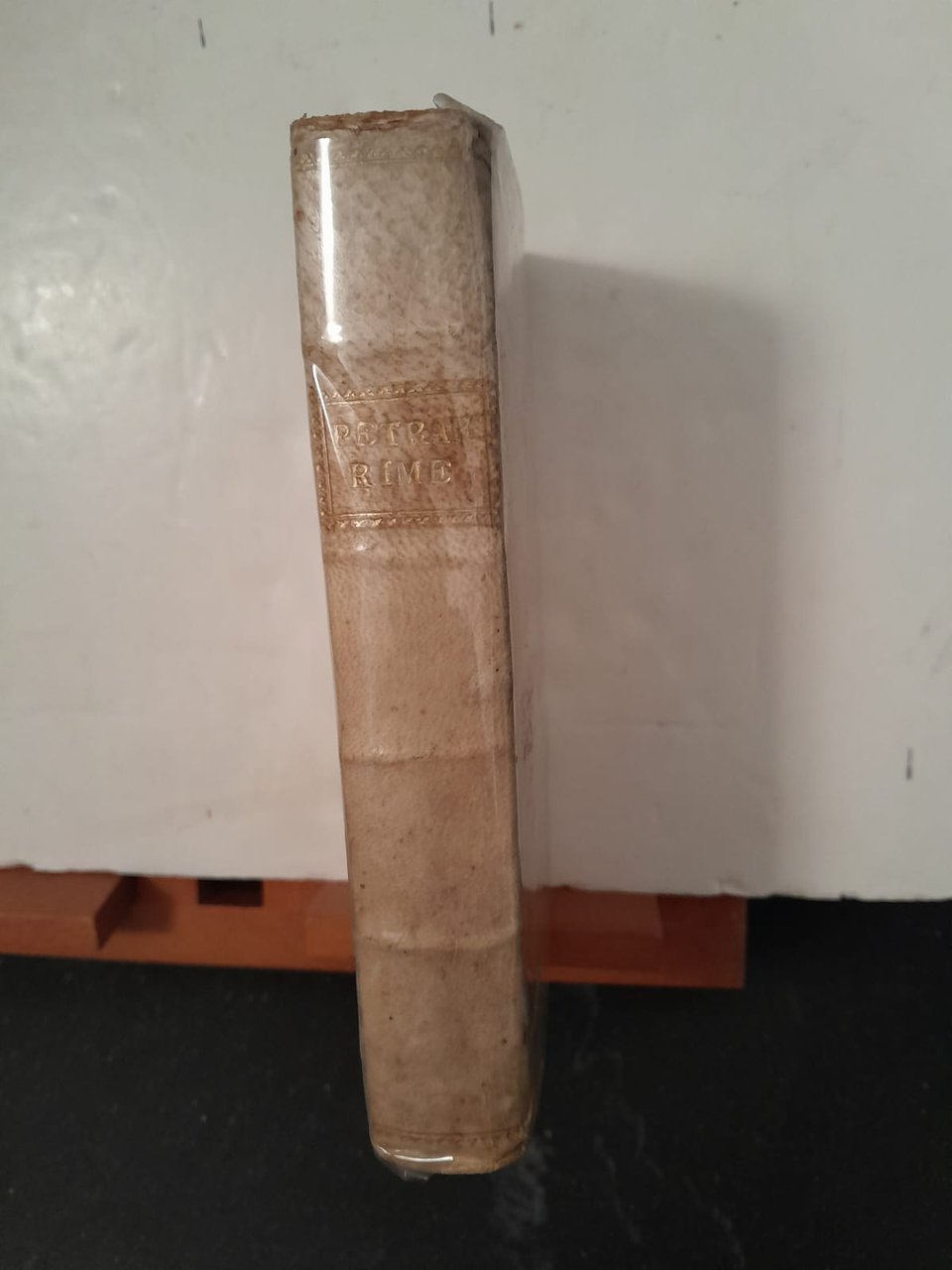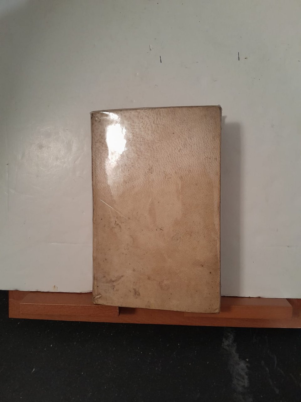 Volume in 8° legatura in pelle (pergamena?) con tassello sul dorso.