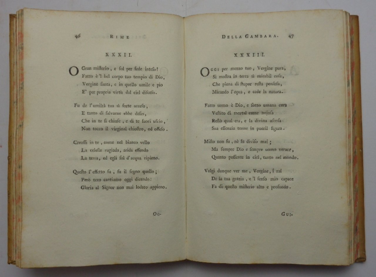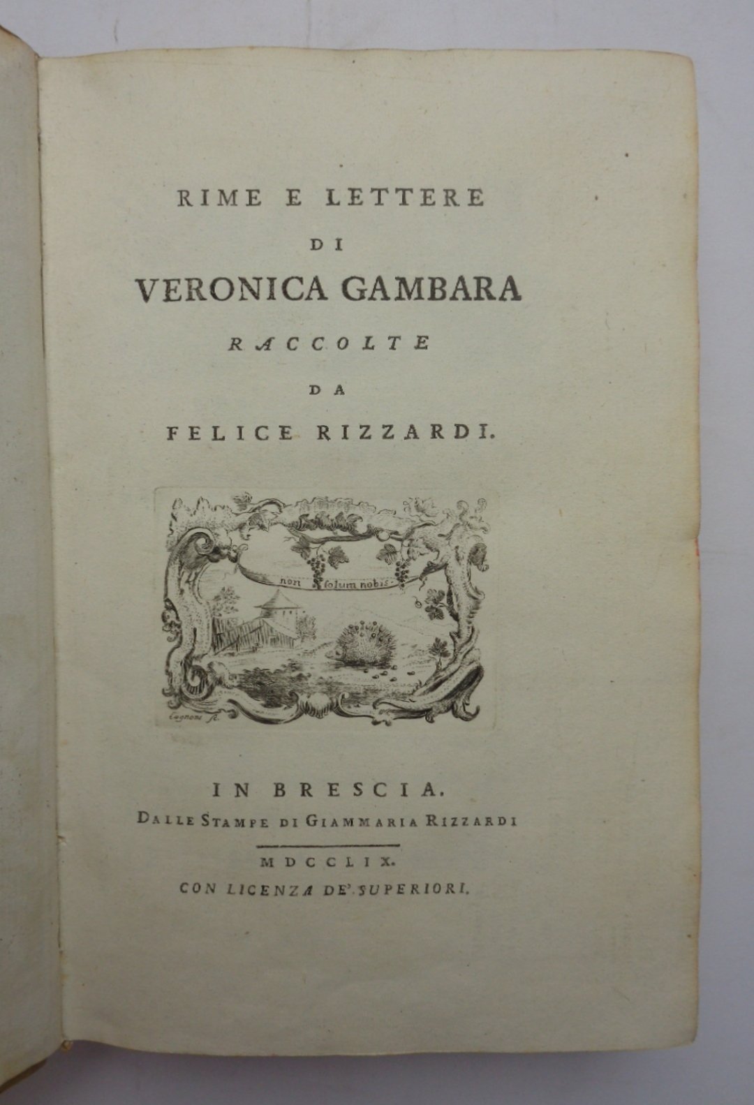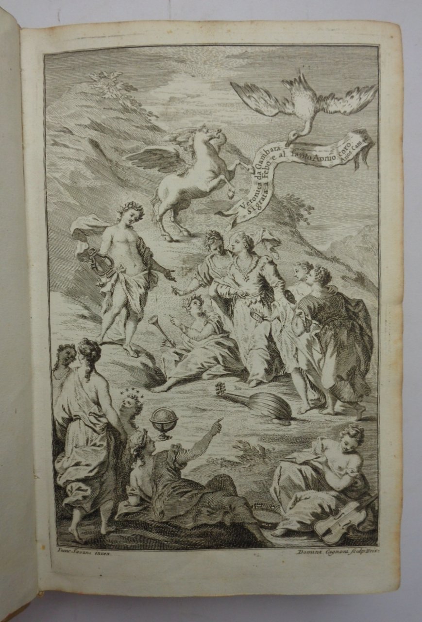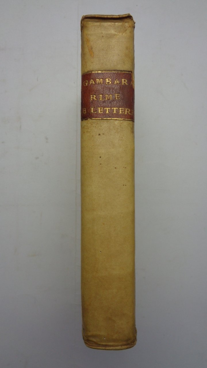 "...raccolte da Felice Rizzardi". Un volume (21 cm) di LXXXV-298 pagine; legatura coeva in piena pergamena rigida, con dorso liscio e tassello di titolo; tagli colorati a serpentina. Antiporta incisa, altra incisione a piena pagina prima delle lettere e stemma dei Rizzardi inciso a piena pagina in fine, tutte opere del Cagnoni. Un albero genealogico ripiegato ft. Graziose testatine e finali incisi. Stampato su carta forte di assoluto candore, che mette in risalto l'eccellenza tipografica del Rizzardi, il quale rende così omaggio alla sua concittadina. Eccellente esemplare di questa raccolta delle poesie e delle lettere di una delle più famose letterate italiane del Rinascimento.