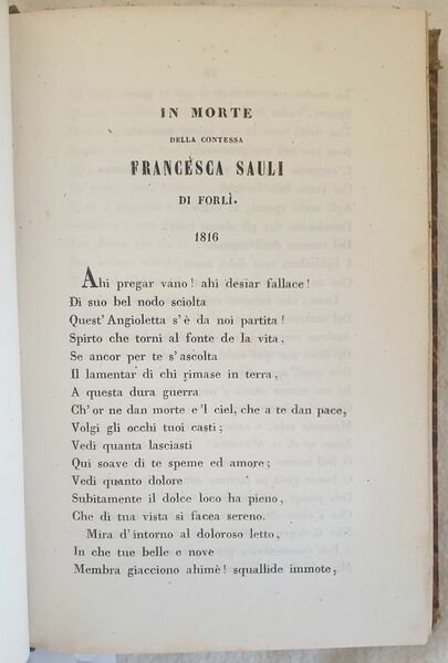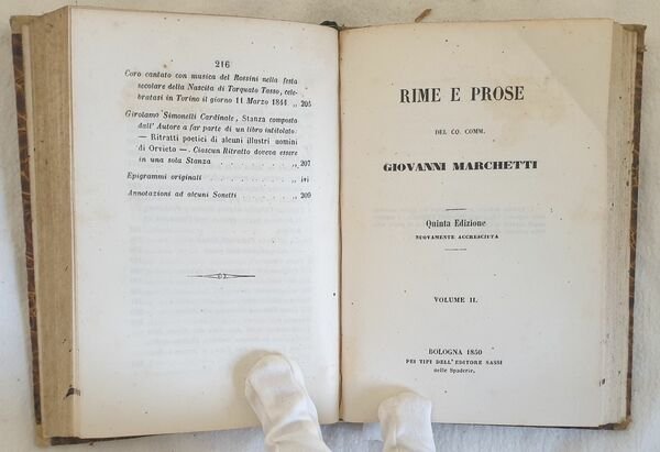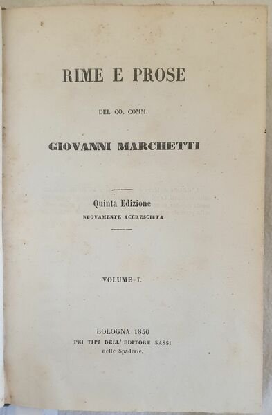 Edizione del 1850 di questa raccolta di rime e prose di Giovanni Marchetti (Senigallia 1790-Bologna 1852) poeta politico e dantista italiano. Tavola più volte ripiegata con ritratto di Guido de Pepoli, antiporta della memoria. L'opera è composta da due tomi legati insieme in un unico volume ed è completa. In buone condizioni. Copertina in mezza tela coeva con titolo in oro al dorso in buone condizioni generali con lievi usure ai margini e dorso. Legatura in buone condizioni. All'interno le pagine si presentano in buone condizioni con rare fioriture. In 16. 17x12 cm. Pp. XXI+216+228. Edition of 1850 of this colelction of rhymes and proses by Giovanni Marchetti (Senigallia 1790-Bologna 1852) italian poet. Folded plate with the portrait of Guido de Pepoli, forntspice of the memory. The work is made up of two tomes bound together and it is complete. In good conditions. Half cloth cover with gilted title in the spine in good general conditions lightly worn in the extremities. Binding in good conditions. Inside pages are in good conditions with foxing. In 16. 17x12 cm. Pp. XXI+216+228.<BR><BR>