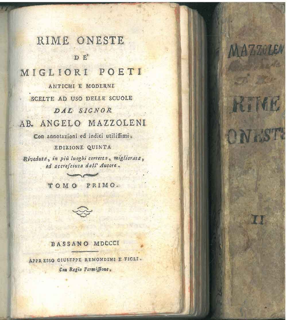 Rime oneste de' migliori poeti antichi e moderni scelte ad uso delle scuole dal signor ab. Angelo Mazzoleni con annotazioni ed indici utilissimi. Edizione quinta riveduta, in più luoghi corretta, migliorata, ed accresciuta dall'autore
