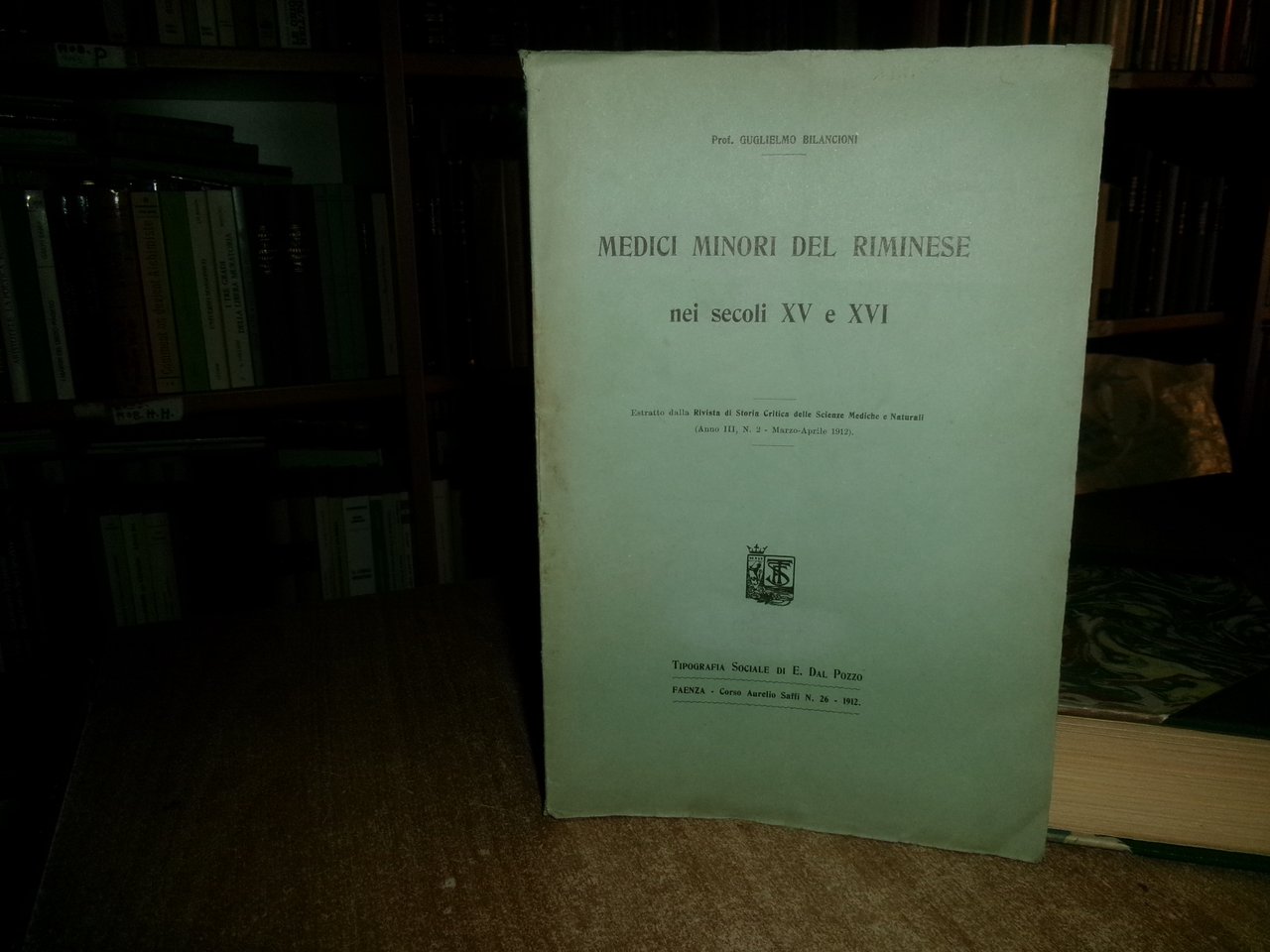 (Rimini) Guglielmo Bilancioni. Faenza, Tipografia Sociale di E. Dal Pozzo, 1912. MEDICI MINORI DEL RIMINESE. Estratto dalla Rivista di Storia critica delle Scienze Mediche e Naturali. In-8°, br. orig. 16 pp. Raro opuscolo ben conservato. Neg. mob. nero 10 entro busta trasp.