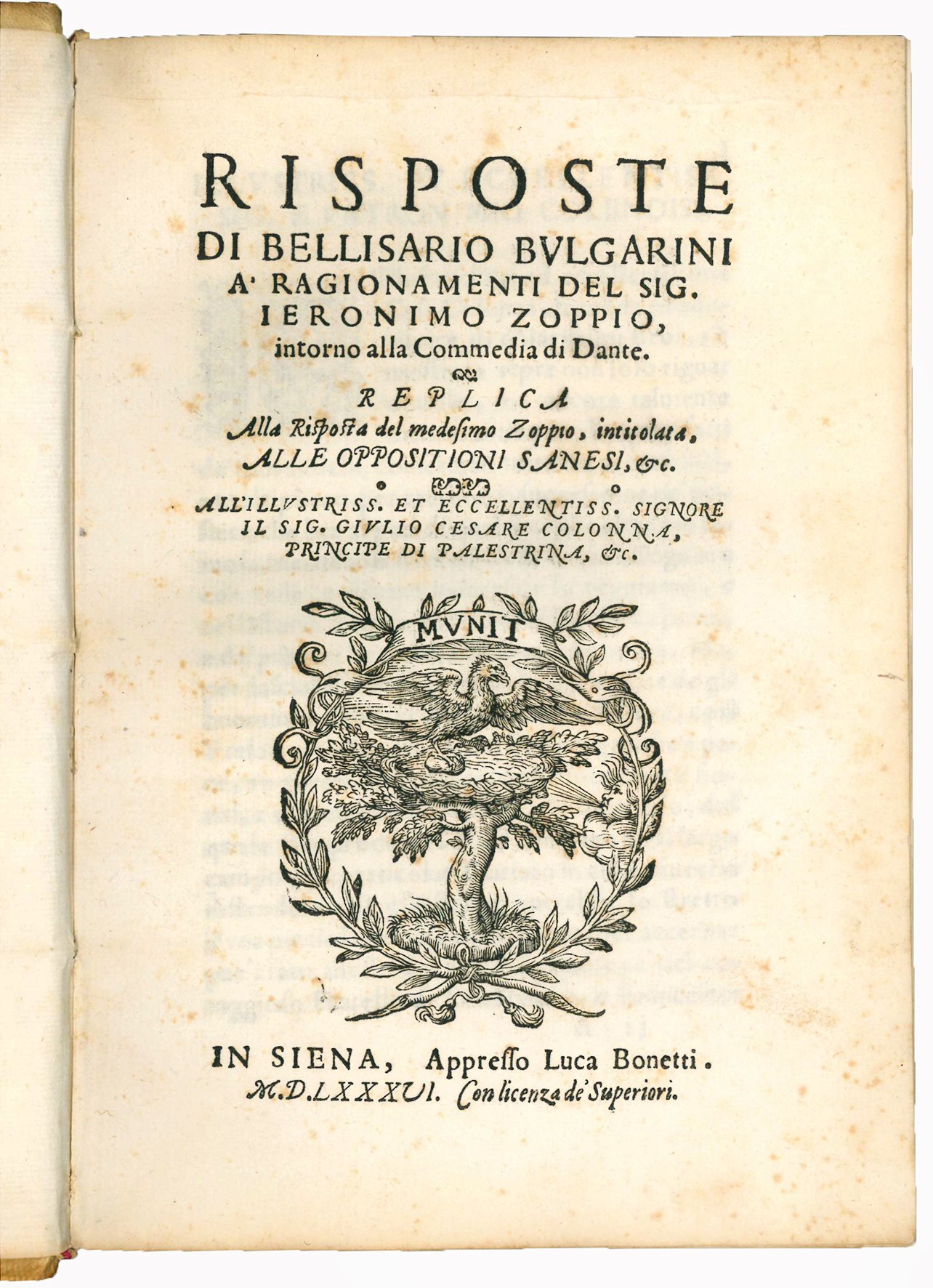 Risposte di Bellisario Bulgarini a' Ragionamenti del Sig. Ieronimo Zoppio, intorno alla Commedia di Dante. Replica alla risposta del medesimo Zoppio, intitolata, alle opposizioni sanesi, &c. [...]