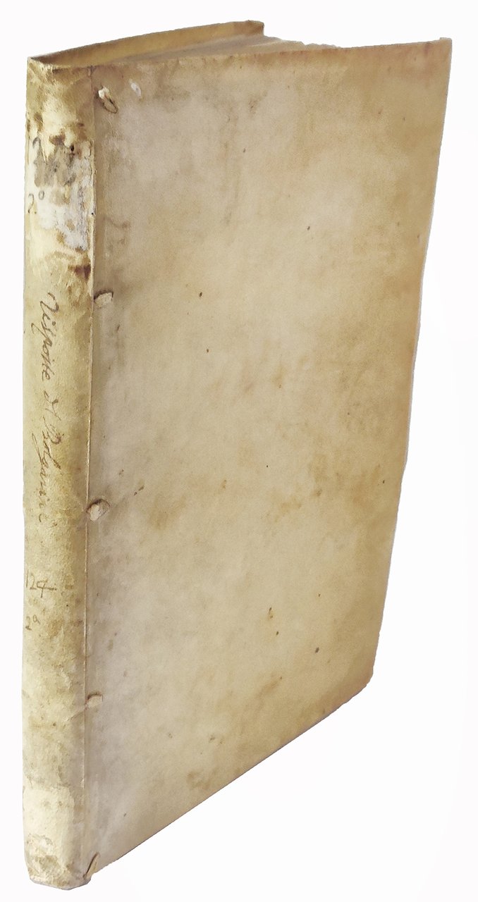 4to (220x151 mm). 237, [3] pp. Collation: A-Gg4. The Replica del medesimo Bellisario Bulgarini, alla risposta del predetto sig. Ieronimo Zoppio, intitolata, alle opposizioni sanesi begins with a separate title page on l. Bb3v. Printer's devices on both title pages and at the end. Contemporary limp vellum with overlapping edges, inked title along the spine (traces of ties). Some occasional foxing and browing, a few marginal stains, small round worm hole to the blank margin of a few leaves at the end of the volume not affecting the text, overall a very good, fresh, and extremely genuine copy.