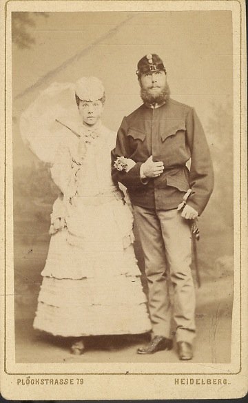 Ritratto fotografico di una giovane coppia, lui in uniforme militare, lei con un ombrellino. Applicato su cartoncino; formato mm. 85x55 (la foto), mm. 100x62 (il cartoncino). Al verso del cartoncino l'intestazione a stampa: "Eduard Schulzte 79 Plöckstrasse Heidelberg".