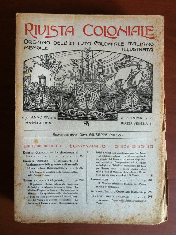 RIVISTA COLONIALEAnno XIV Maggio 1919Organo dell'Istituto Coloniale ItalianoMensile IllustrataRedattore Capo Dott. Giuseppe Piazza formato 18x25,5 cmin buono stato salvo gore umidità (gr. 80)E16920