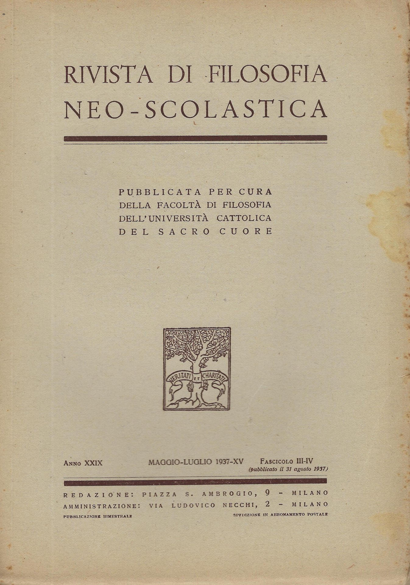 Rivista di filosofia neo-scolastica anno XXIX, fascicolo 3-4, maggio-luglio 1937
