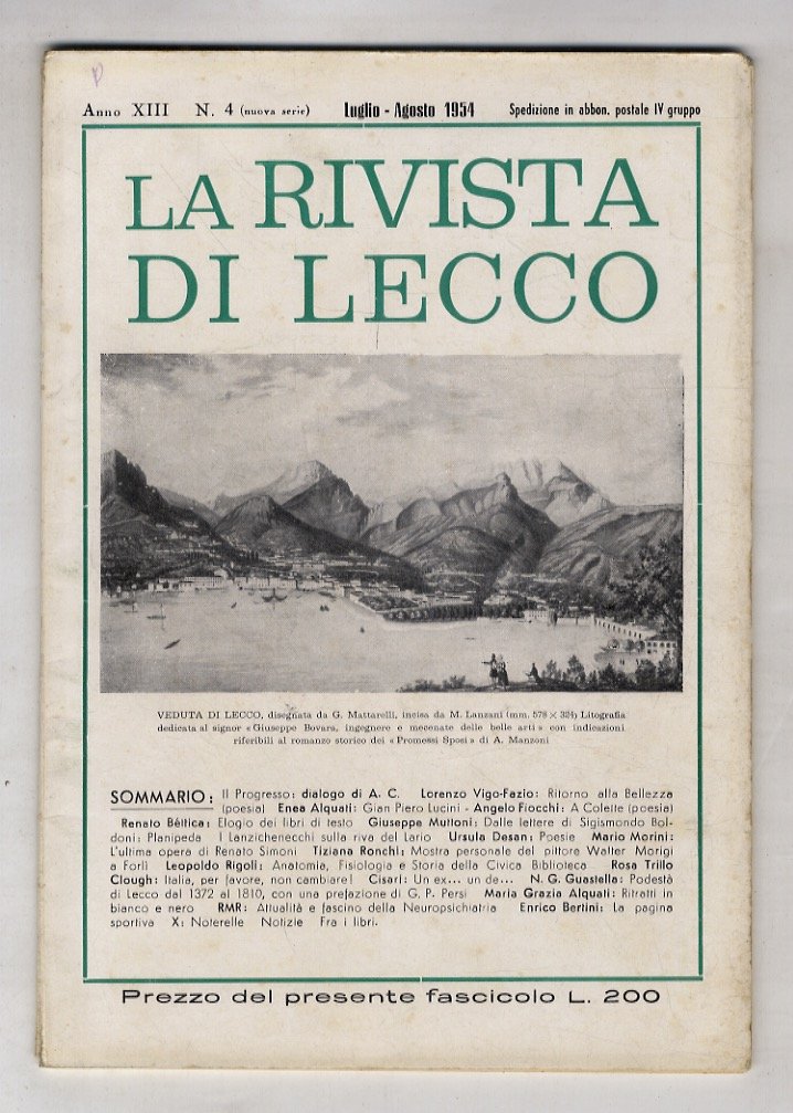 Lecco, Tipografia Beretta, 1954, un fascicolo in-8, br. editoriale figurata, pp. 59, [5]. Con illustrazioni n.t. Dall'indice: Enea Alquati "Gian Piero Lucini", Giuseppe Muttoni "I lanzichenecchi sulla riva del Lario", poesie di Ursola Desan, Leopoldo Rigoli "Anatomia, fisiologia e storia della civica biblioteca", ecc.