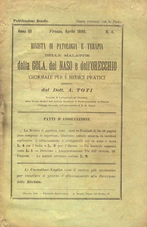 RIVISTA di patologia e terapia delle malattie della gola, del naso e dell'orecchio. Giornale per i medici pratici diretto da A. Toti. Anno III. N. 4. Firenze aprile 1896.