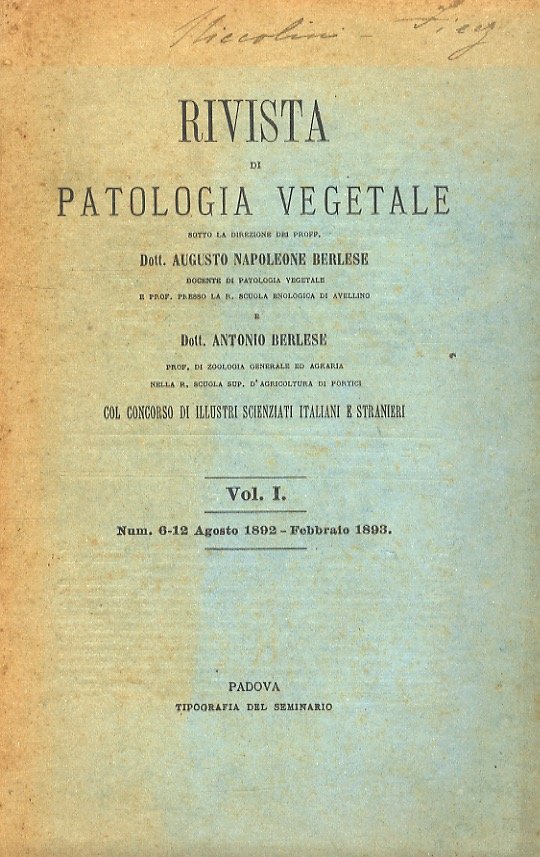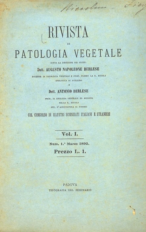 RIVISTA di patologia vegetale, sotto la direzione dei proff. Dott. Augusto Napoleone Berlese [.] e Dott. Antonio Berlese [.] col concorso di illustri scienziati italiani e stranieri. Vol. 1, numeri: 1, Marzo 1892; 2-5, aprile-luglio 1892; 6-12, agosto 1892 - febbraio 1893. [Annata completa].
