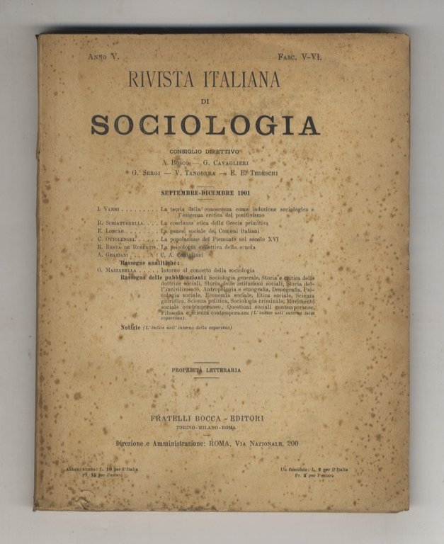 Torino, Fratelli Bocca, 1901, in-8, br. editoriale, pp. numerate da 549 a 800. Dall'indice segnaliamo: R. Schiattarella "La coscienza etica della Grecia primitiva", E. Loncao "La genesi sociale dei comuni italiani", C. Ottolenghi "La popolazione del Piemonte nel secolo XVI", ecc. Fioriture alle copertine, una non pesante brunitura interna.