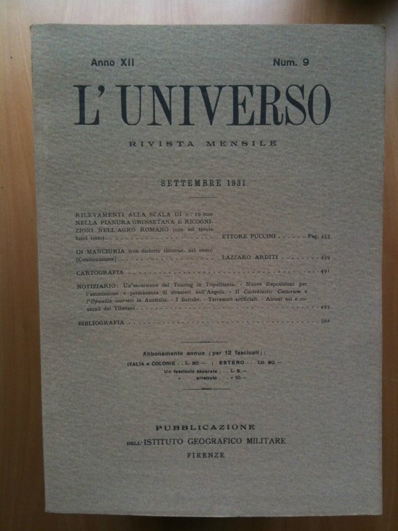 L'UNIVERSORivista mensile - Pubblicazione dell'Istituto Geografico Militare - FirenzeAnno XII Num. 9 Settembre 1931All'interno: Rilevamenti alla scala di 1 : 10.000 nella pianura Grossetana e ricognizioni nell'Agro Romano - In Manciuriain buono stato (gr 230)E3559