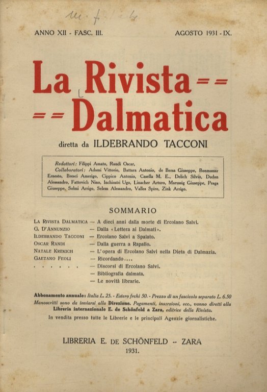 Zara, Libreria E. De Schönfeld, 1931, un fascicolo in-8, br. editoriale, pp. 72. Dall'indice: "A dieci anni dalla morte di Ercole Salvi", G. D'Annunzio "Dalla Lettera ai Dalmati", Ildebrando Tacconi "Ercolano Salvi a Spalato", Natale Krekich "L'opera di Ercolano Salvi nella Dieta di Dalmazia". Lievi fioriture alla brossura.