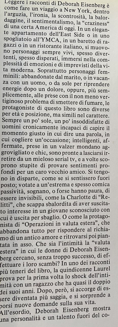 Leggere i racconti di Deborah Eisenberg è come fare un viaggio a New York, dentro l'arguzia, l'ironia, la scontrosità, la balordaggine, il sentimentalismo, la craziness di una certa America di oggi. In un elegante appartamento dell'East Side o in uno spogliatoio all'YMCA, in un baretto di ragazzi o in un ristorante italiano, si muovono personaggi sempre vivi, spesso divertenti, spesso disperati, immersi nella complessità di emozioni e di imprevisti della vita moderna. Soprattutto personaggi femminili: abbandonate dal marito, o in vacanza con un uomo, o da sole per riprendere energie dopo un dolore, oppure, più semplicemente, alle prese con il non meno vertiginoso problema di smettere di fumare, le protagoniste di questo libro sono diverse per età e posizione, ma simili nel carattere. Sempre un po' sole, un po' insoddisfatte di uomini cronicamente incapaci di capire il momento giusto in cui dire una parola, in cui cogliere un'occasione; intelligenti, affermate, prese in un valzer mondano aggrovigliato e chic, sono pronte a lasciarsi irretire da un mieloso serial tv, e a volte scoprono stupite di provare sentimenti profondi per un caro vecchio amico. Si tengono in disparte, come se si sentissero fuori posto; votate a un'estrema e spesso comica passività, sognano, o forse hanno paura, di essere invisibili, come la Charlotte di Relitti, che scappa sbalordita di aver suscitato interesse in un giovane sconosciuto con cui è uscita per sbaglio. O come la protagonista di Operazioni in valuta estera, che abbandona tutto per rispondere al richiamo di un antico amore e ritrovarsi poi piantata in asso. Che sia l'intimità la valuta estera in cui le donne di Deborah Eisenberg cercano, senza troppo successo, di effettuare i loro scambi? In uno dei racconti più teneri del libro, la quindicenne Laurel prova per la prima volta lo shock dell'intimità con un ragazzo che ha quasi il doppio dei suoi anni. Dopo, però, si accorge di essere diventata più saggia, e si sorprende a porsi nuove domande sulla sua vita. All'esordio, Deborah Eisenberg mostra una personalità e un talento fuori del come una costruzione unitaria. Invece sa benissimo dove vuole arrivare, e quando ci arriva è come un'illuminazione: Trovo infinitamente interessante capire come a ciascuno avvenga di trovarsi a vivere la sua vita quello strano insieme di circostanze che è la vita di ognuno di noi.