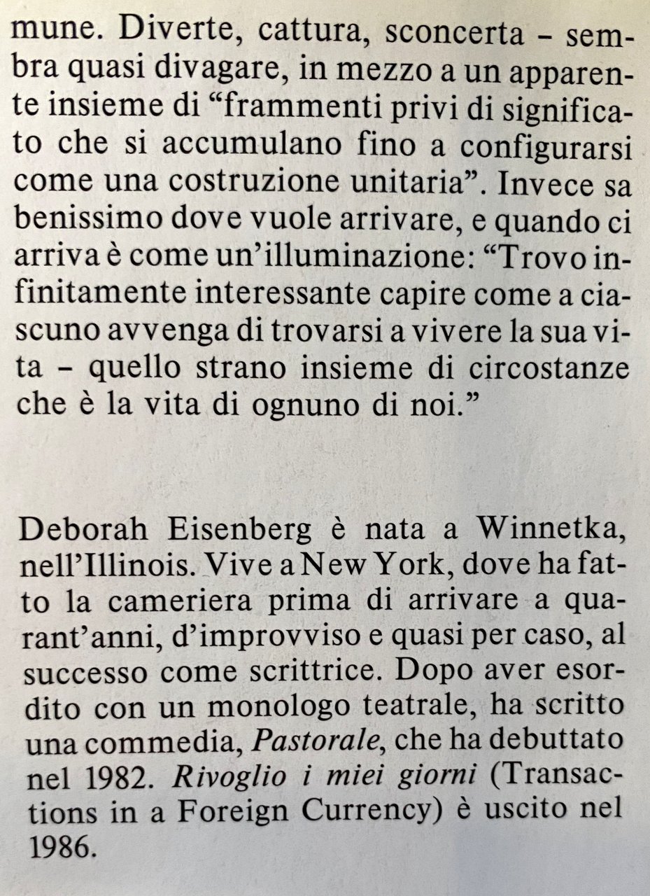 Deborah Eisenberg è nata a Winnetka, nell'Illinois. Vive a New York, dove ha fatto la cameriera prima di arrivare a quarant'anni, d'improvviso e quasi per caso, al successo come scrittrice. Dopo aver esordito con un monologo teatrale, ha scritto una commedia, Pastorale, che ha debuttato nel 1982. Rivoglio i miei giorni (Transactions in a Foreign Currency) è uscito nel 1986.