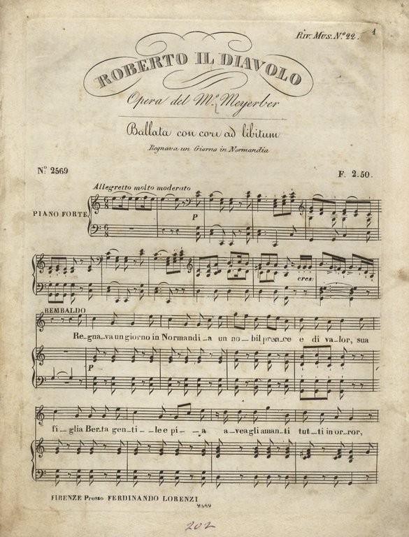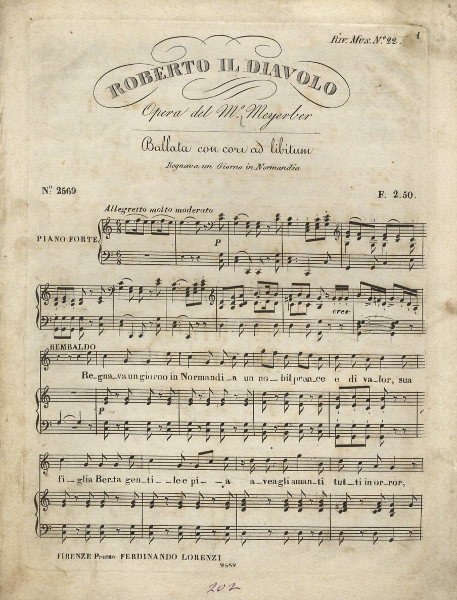 Roberto il diavolo. Opera del M.o Meyerber [sic]. Ballata con cori ad libitum.