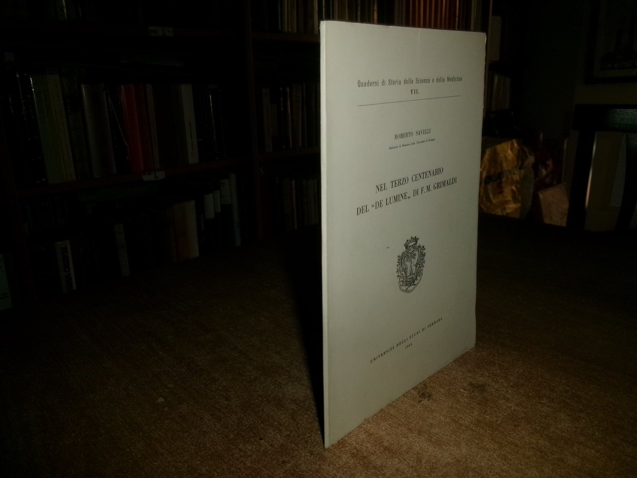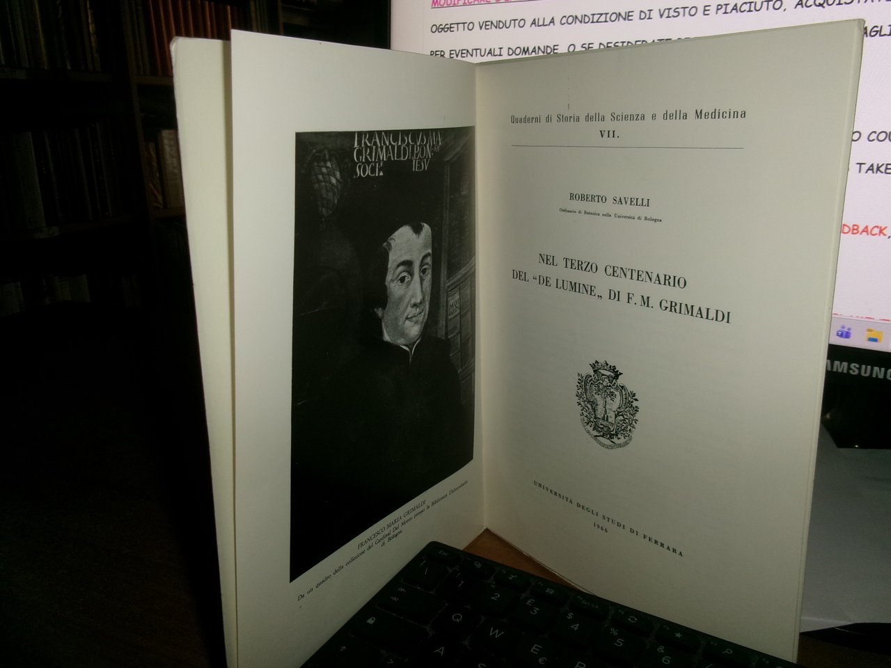 ROBERTO SAVELLI. Nel Terzo Centenario del "DE Lumine" di F. M. Grimaldi. Ferrara, Università degli Studi, 1966. In-8°, br. edit. 28 pp. con alcune figure e ritratto in antiporta. Opuscolo in ottimo stato. Neg. mob. rosso in busta trasp.