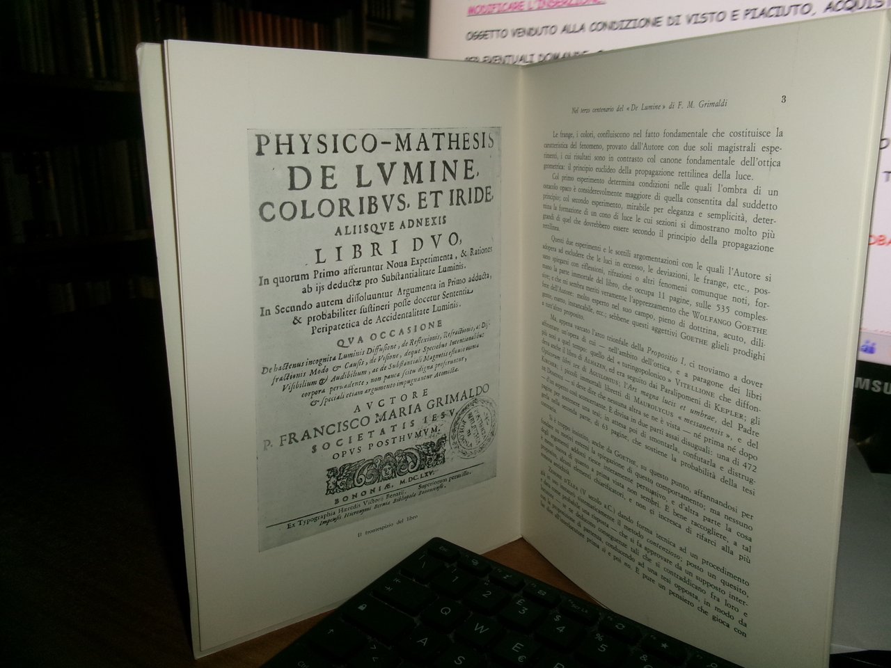 ROBERTO SAVELLI. Nel Terzo Centenario del "DE Lumine" di F. M. Grimaldi 1966 | Libri antichi e moderni |