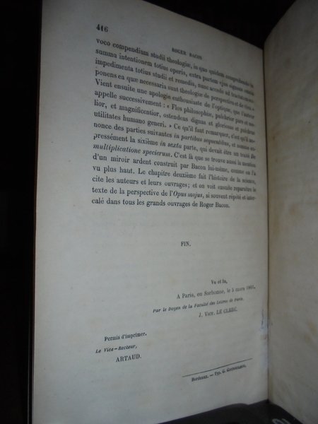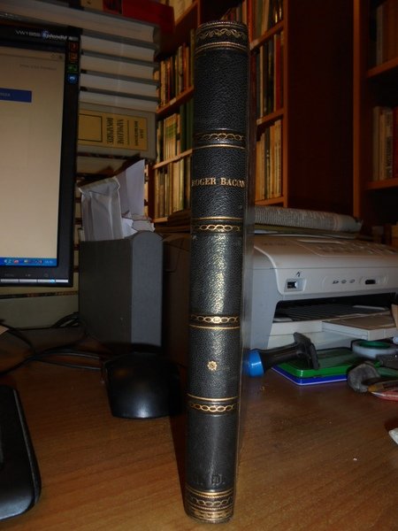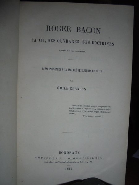 ROGER BACON sa vie, ses ouvrages, ses doctrines. D' après des textes inédits. Par Emile Charles. Bordeaux, Typographie G. Gounouilhou, 1861. Prima edizione. In-8°, m-pelle coeva, dorso con 4 nervetti, fregi e titolo in oro. xv, (i), 416 pp. Ottimo esemplare con ex Libris al verso della copertina. Neg. lett. ant. mob. 6