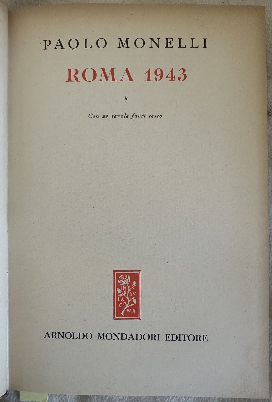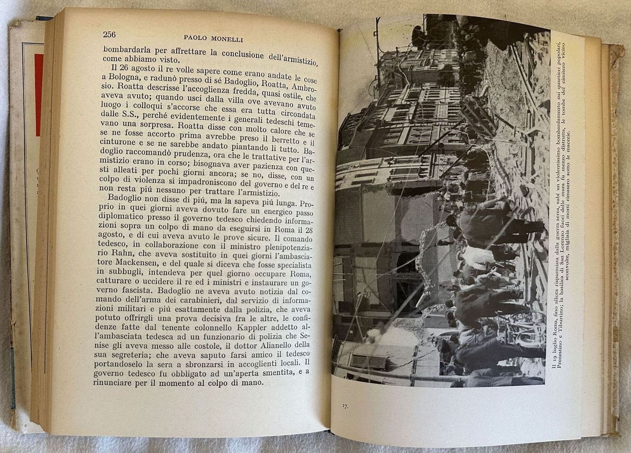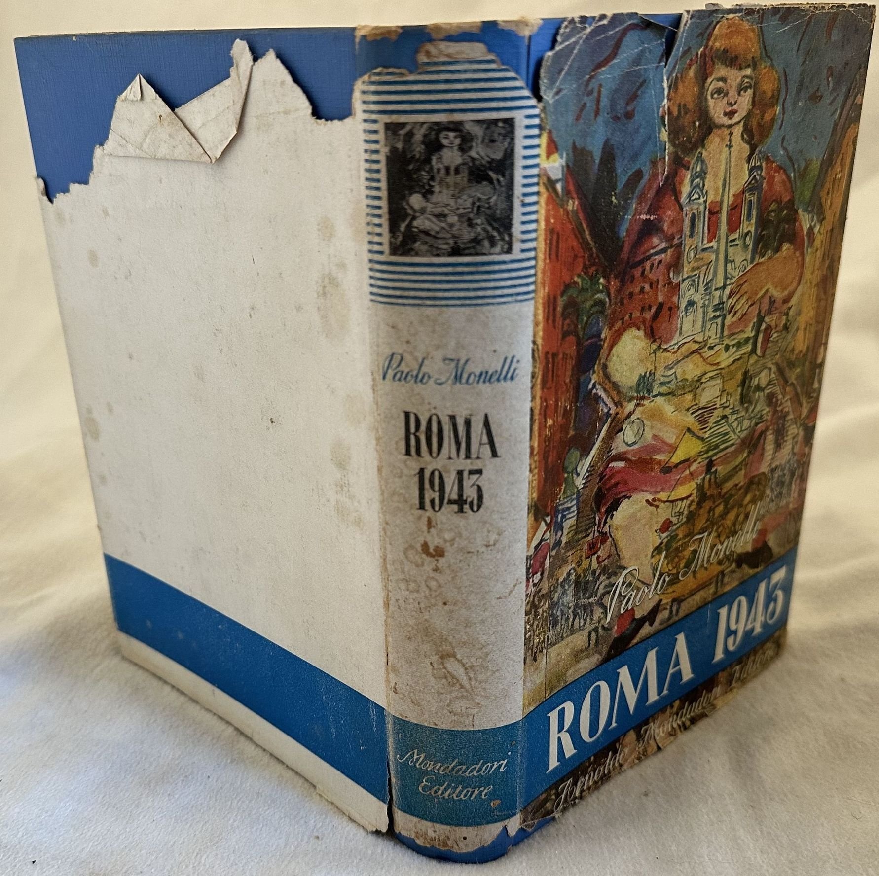 Edizione del 1948 di questa monografia su Roma nel 1943 di Paolo Monelli. All'interno sono presenti 21 tavole fuori testo in bianco e nero (Le tavole a pag. 216 sono mancanti). All'interno: Stato d'animo del paese all'inizio del 1943; Mussolini e Ciano; Antifascismo allusivo; L'arresto di Mussolini; I bombardamenti aerei dell'agosto; l'arresto di Mussolini; Le giornate di settembre a Roma; Convegno di Tarvisio; Il viaggio del generale Taylor a Roma, La battaglia intorno a Roma; L'occupazione tedesca. ecc. In buone condizioni Copertina editoriale con sovraccoperta in buone condizioni generali con lievi usure ai margini e dorso. Sovraccoperta con usure. Legatura in buone condizioni. All'interno le pagine si presentano in ottime condizioni con rare fioriture. In 16. Dim. 20x14 cm. Pp. 401+(3). Edition of 1948 of this monography about Rome in 1943 by Paolo Monelli. Inside there are 21 out of the text black and white plates (Plats in pag. 216 are missing. Inside: Stato d'animo del paese all'inizio del 1943; Mussolini e Ciano; Antifascismo allusivo; L'arresto di Mussolini; I bombardamenti aerei dell'agosto; l'arresto di Mussolini; Le giornate di settembre a Roma; Convegno di Tarvisio; Il viaggio del generale Taylor a Roma, La battaglia intorno a Roma; L'occupazione tedesca. ecc. In good conditions. Editorial cover with dustjacket in good conditions lightly worn in the extremities.Dustjacket with wearings. Binding in good conditions. Inside pages are in very good conditions with occasional foxings. In 16. Dim. 20x14 cm. Pp. 401+(3). <BR><BR> <BR><BR>