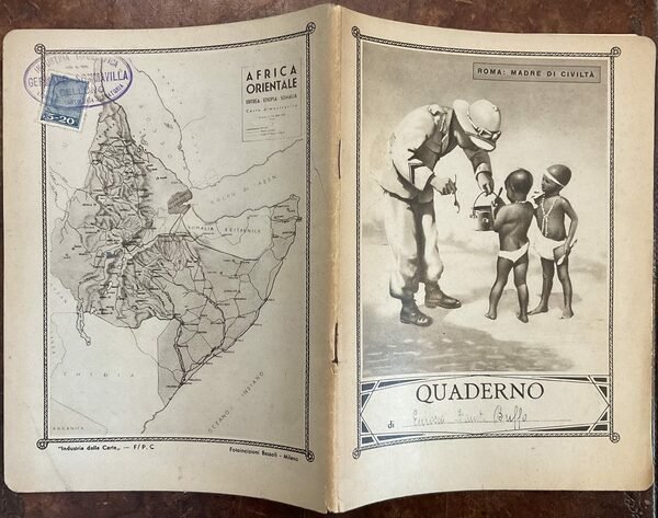 Molto buono. Quaderno a righe, bross. ill. spillata, 20.5 cm, 80 pp delle quali le prime 50 contengono ‘Appunti sul Fedone - I Liceo - 1940’, in bella copia. Marca da bollo per quaderni e timbro al retro