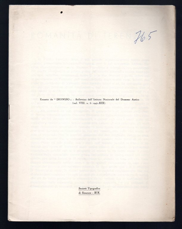 Opuscolo vintage. Estratto da DIONISO. - Bollettino dell' Istituto Nacionale del Dramma Antico (vol. VIII, n. 6 1941-XIX). Segni di biro in copertina. Ordinario segno del tempo. Piega centrale