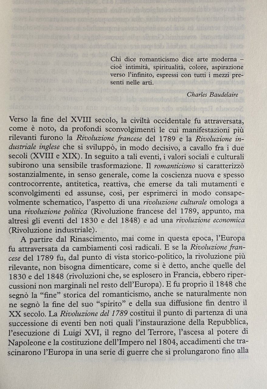 Tra la fine del XVIII e i primi decenni del XIX secolo, nell'età delle rivoluzioni (politiche, economiche, culturali), l'Europa fu attraversata da trasformazioni storiche ed antropologiche essenziali. Nell'ambito della cultura e delle arti, il movimento che più di altri seppe riflettere lo spirito del tempo fu il Romanticismo, tendenza che auspicava sia il recupero della tradizione che una propria identità controcorrente. La ricostruzione messa a punto in questo volume fa ben emergere come, nell'età romantica, l'arte (attraverso le poetiche di artisti quali Goya, Friedrich, Géricault, Delacroix, Turner, Fontanesi) si sia manifestata secondo modalità plurali e perciò, di volta in volta, come naturalistica, storica, simbolica. Un'arte radicata nella civiltà filosofica, letteraria e musicale del tempo, le cui espressioni costituiscono uno degli archetipi fondamentali della creatività estetica dell'Occidente.