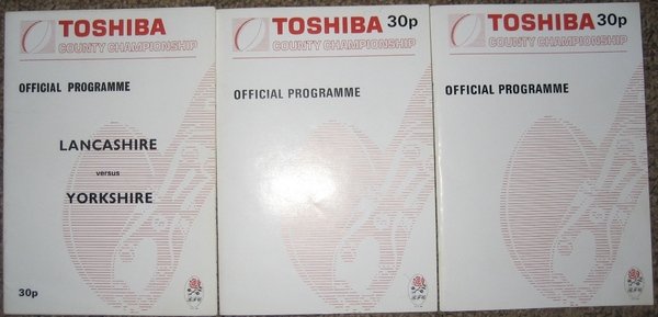 Three programmes. No marks or inscriptions. Minor creasing adjacent to spine. Very clean very tight copies with bright unmarked boards and no bumping to corners. pp. Three rugby programmes from the 1989/90 season - all Yorkshire matches . Yorks v Durham 30 Sep, Yorks v Cumbria 7 Oct, Lancs v Yorks 21 Oct.