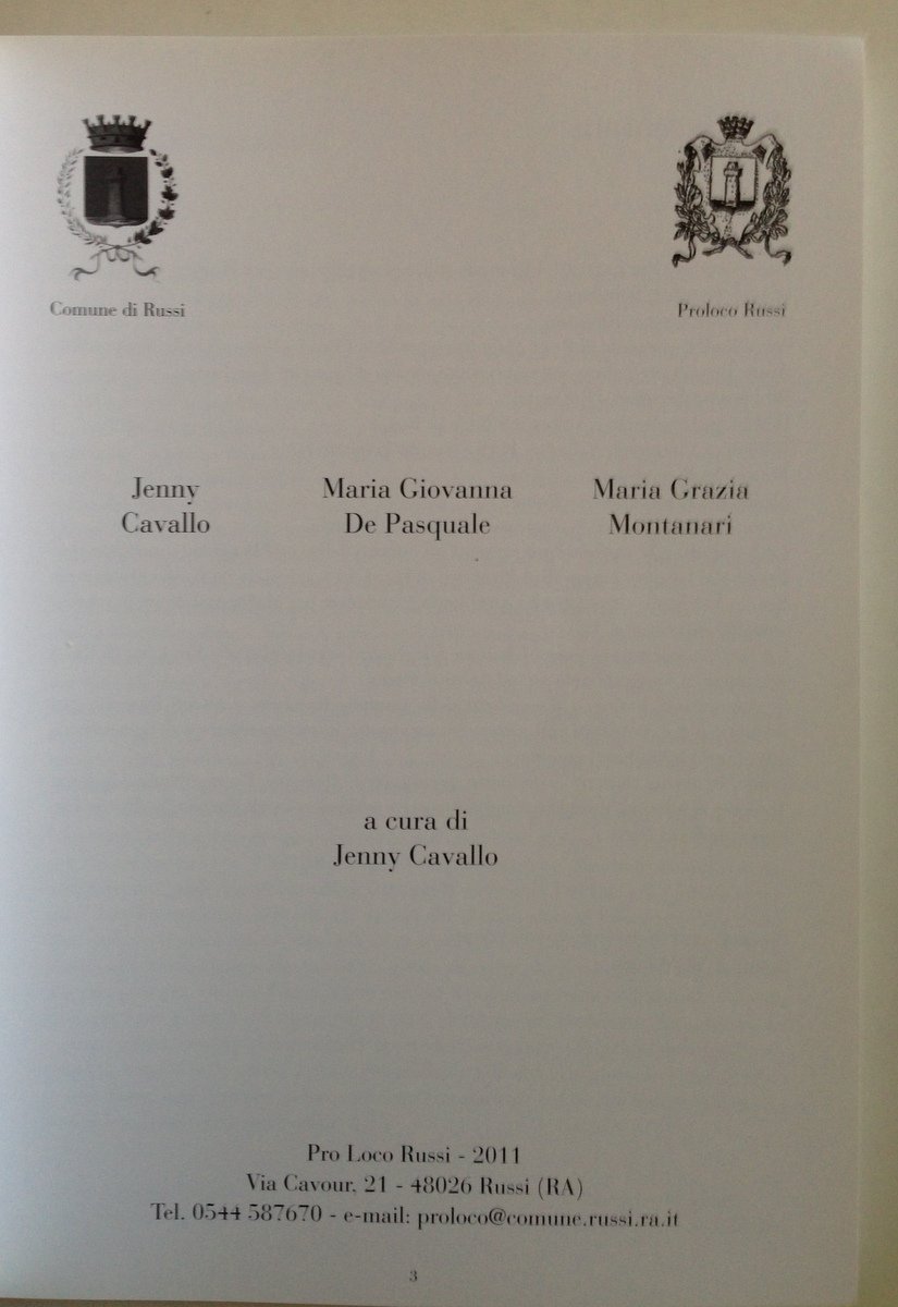 Cavallo J., Russi Voci del Risorgimento Pro Loco Russi, Russi, 2011, 24x14 cm, pp. 208 , cartoncino ed. ill. Condizioni di conservazione Esemplare in condizioni molto buone. SETT96.L8967 blu