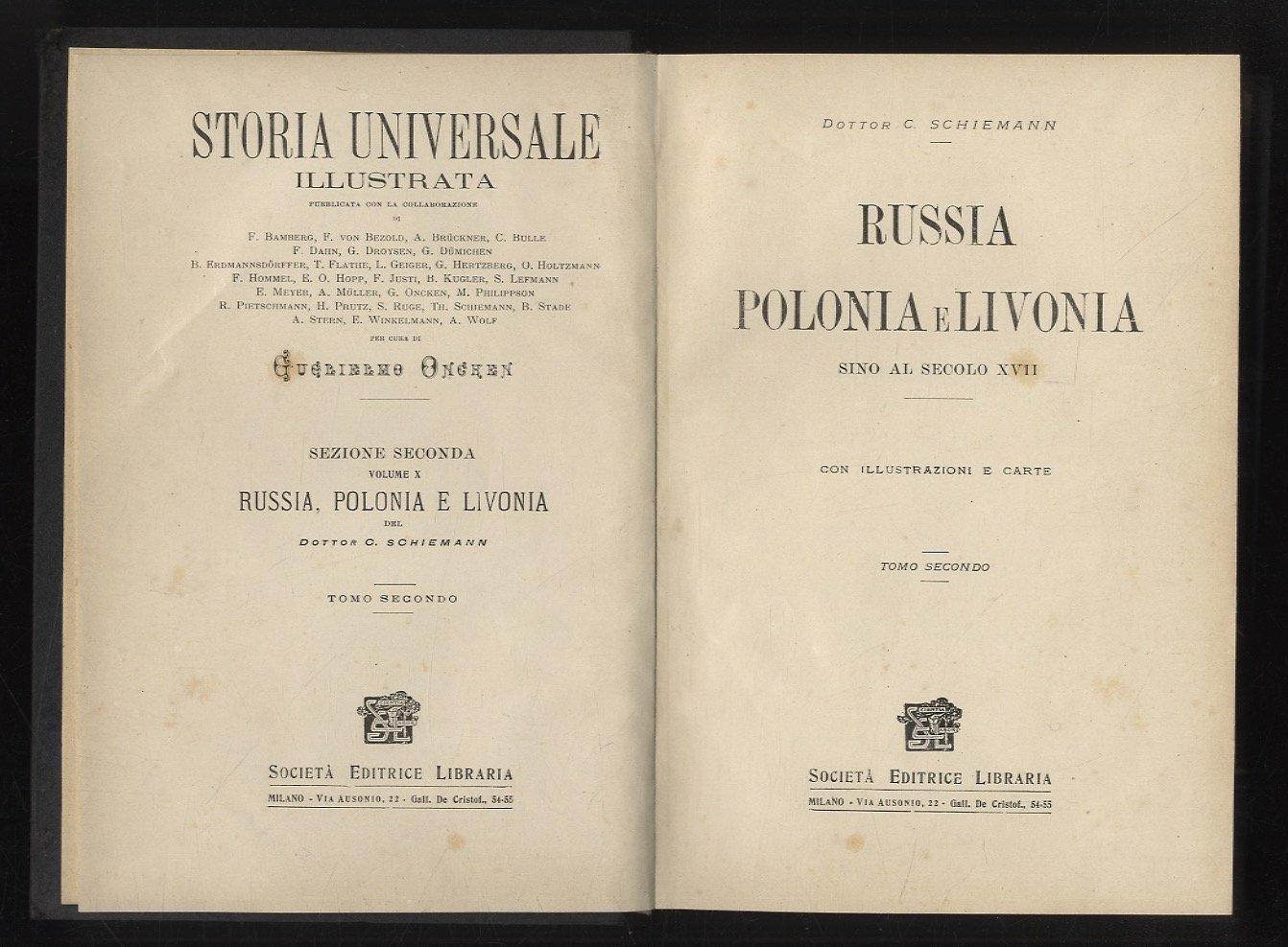 Milano, Società Editrice Libraria, 1915-1913, voll. 2 in-8, legatura editoriale, in piena tela, titolo in oro al dorso, piatto anteriore con titolo e fregio dorati, pp. [4], 870 - [4], 515, [1]. Con numerose illustrazioni, n.t. e su tavole f.t. (fra le altre una veduta della città di Grodno e la grande raffigurazione della battaglia di Orscha, 1514, più volte ripiegate). Opera in sé completa ma volumi della "Storia Universale Illustrata" di Wilhelm (Guglielmo) Oncken. Primo tomo con cerniere dei piatti lise e legatura allentata. Lievi fioriture.