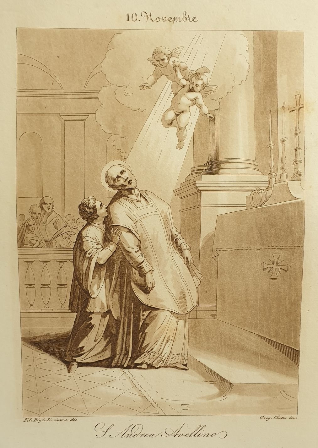 Incisione all'acquatinta del 1843 che mostra San Andrea Avellino (1521-1608) (10 novembre). Autore: Greg. Cleter su disegno di Filippo Bigioli Atlante: Compositions artistiques pour tous les jours de l'annee Data: 1843 Dimensioni foglio: mm 260x190. Dimensione incisione al margine: mm 180x135. In buone condizioni.Nice acquatint of 1843 featuring San Andrea Avellino (1521-1608) (10 novembre). Author: Greg. Cleter after Filippo Bigioli Atlas: Compositions artistiques pour tous les jours de l'annee Date: 1843 Size of the page: mm 260x190. Size in the print: mm 180x135. In good conditions.