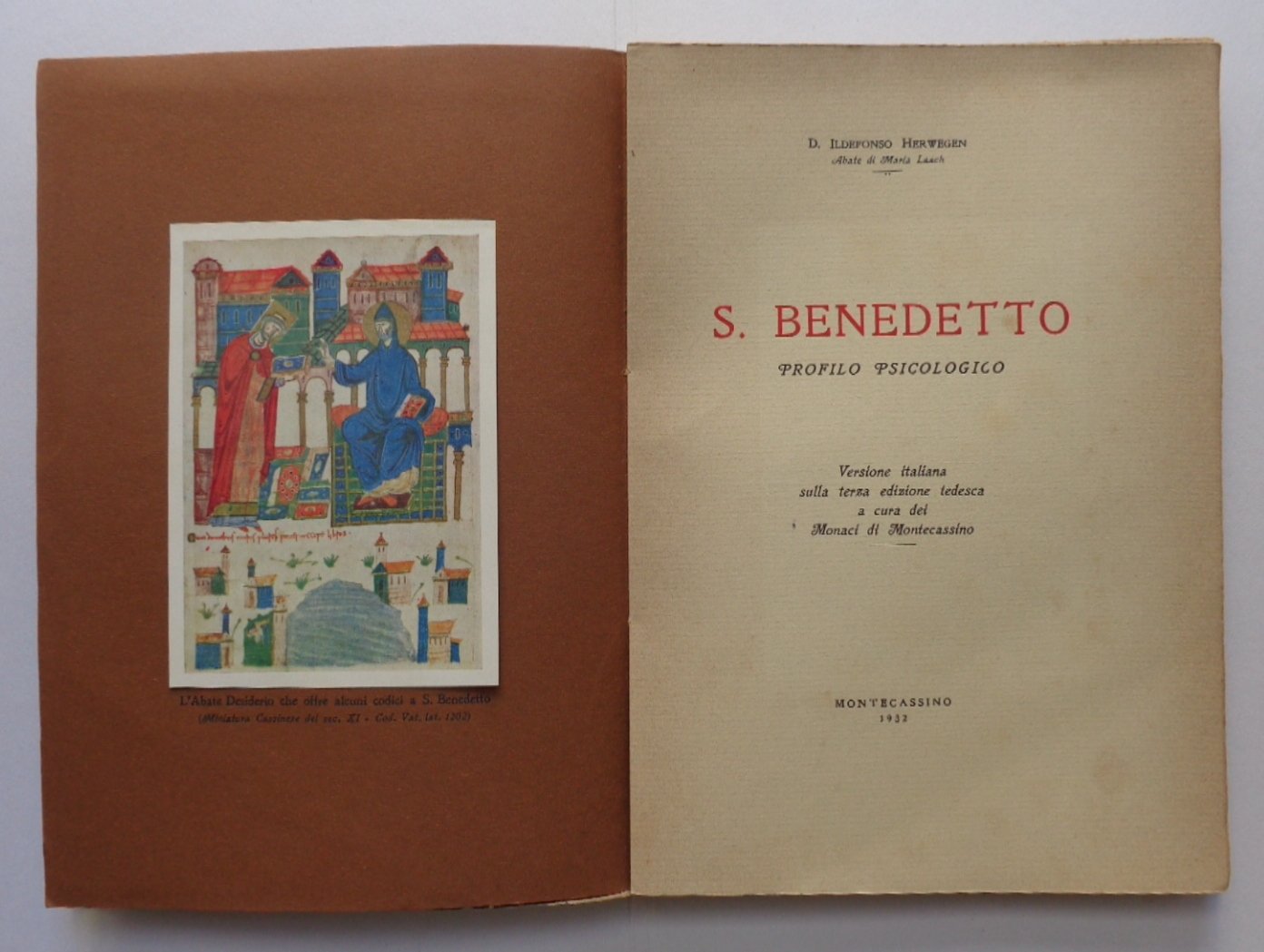 Un volume di X-160 pagine, brossura editoriale. Dimensioni: 18x25 cm. In barbe. Tracce d'uso alla brossura (margini scoloriti, piccole usure ai margini, piccola mancanza e fenditura al dorso); ottimo l'interno. Una illustrazione a colori applicata in antiporta. Versione italiana sulla terza edizione tedesca a cura dei Monaci di Montecassino.