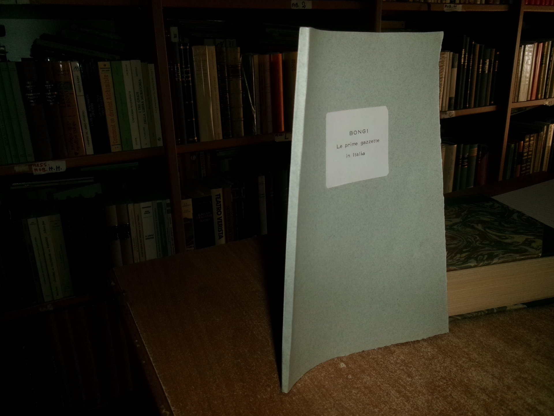 S. BONGI. Le prime Gazzette in Italia (estratto fotocopiato da Nuova Antologia, vol. XI, 1869). In-8°, br. con etichetta sul piani anteriore. da pag. 311 a pag. 346. Ottimo stato Neg. magazz. mob. grigio entro busta trasp.