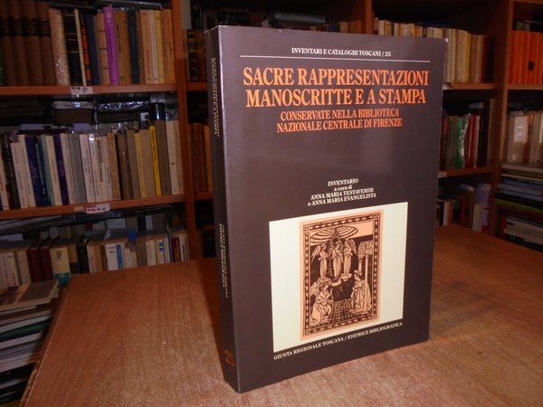 Inventario a cura di Anna Maria Testaverde e Anna Maria Evangelista. Milano, Giunta Regionale Toscana/Editrice Bibliografica, 1988. Sacre rappresentazioni manoscritte e a stampa conservate nella Biblioteca Nazionale Centrale di Firenze. In-4°, cartoncino edit. ill. a col. xvi, 300, (3) pp. con 22 figure a colori e in bianco e nero in tavole fuori testo. In ottimo stato di conservazione. Uff. E - III - 6