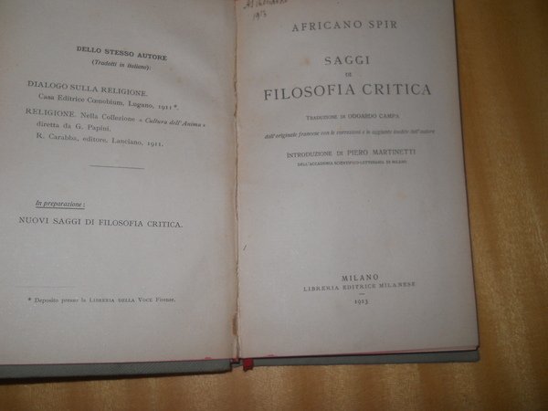AFRICANO SPIR, saggi di filosofia critica - ed. Milanese, 1913