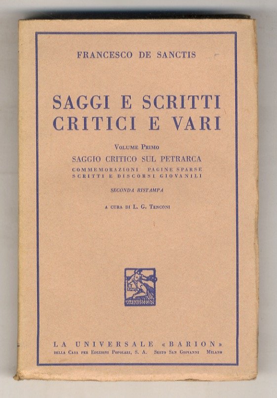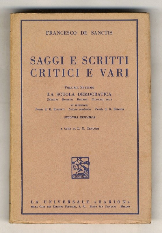 Saggi e scritti critici e vari. Seconda ristampa. A cura di L. G. Tenconi. Vol. I: Saggio critico sul Petrarca. Commemorazioni. Pagine sparse. Scritti e discorsi giovanili. Vol. VI: La Scuola liberale: Grossi, Carcano, D'Azeglio, Gioberti, Rosmini, ecc. Vol. VII: La Scuola democratica: Mazzini, Rossetti, Berchet, Niccolini, ecc.