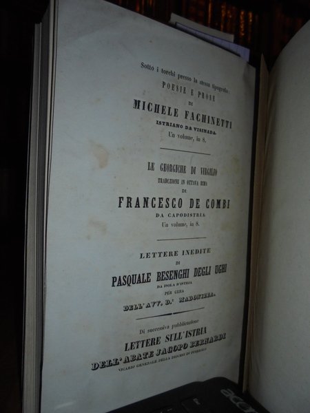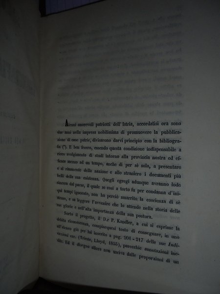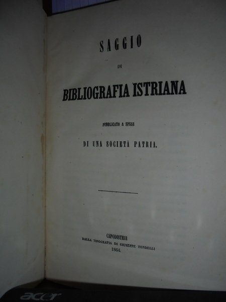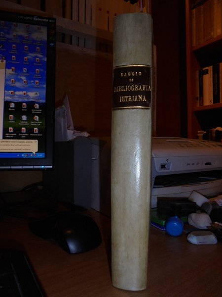 Pubblicato a spese di una Società Patria. Capodistria, dalla Tipografia di Giuseppe Tondelli, 1864. SAGGIO di BIBLIOGRAFIA ISTRIANA. Edizione originale. In-8°, m. pergamena con titolo in oro entro tassello al dorso, copertine originali conservate. vii, (1), 484 pp. Prime pagine leggermente arrossate ma esemplare in ottimo stato di conservazione con le brossure originali conservate. Uff. E - IV - 4