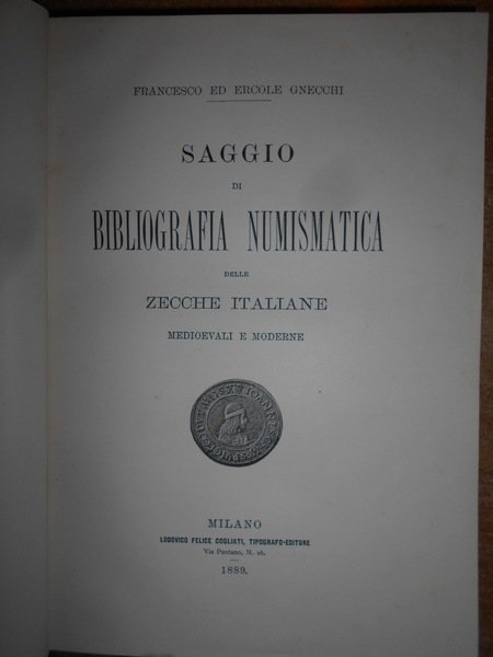 GNECCHI FRANCESCO, GNECCHI ERCOLE. SAGGIO DI BIBLIOGRAFIA NUMISMATICA DELLE ZECCHE ITALIANE MEDIOEVALI E MODERNE. Milano, Lodovico Felice Cogliati 1889. In-8°, tela coeva con titoli in oro al dorso, copertine originali conservate. xxi, 468, (1) pp. Edizione originale di questo classico ancora oggi fondamentale. Uff. E - IV - 1