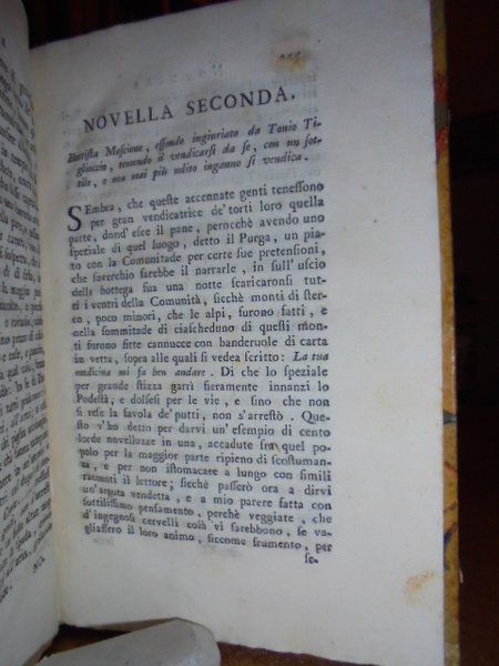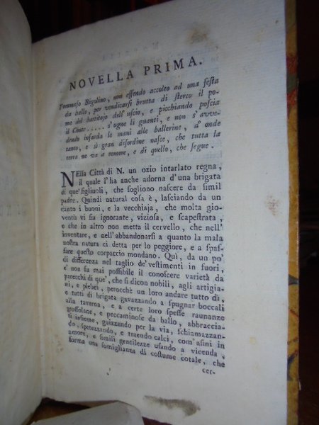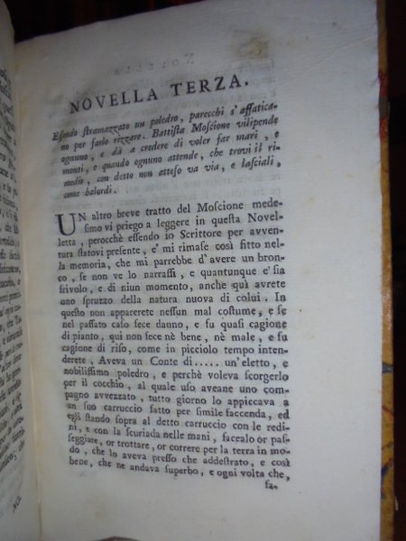 Gozzi, Carlo. (Firenze, 1774). Saggio di novelle. Frammento del volume intitolato Saggio di versifaceti e di prose. In - 8°, m. pergamena coeva. (68) pp. Neg. mob. 3
